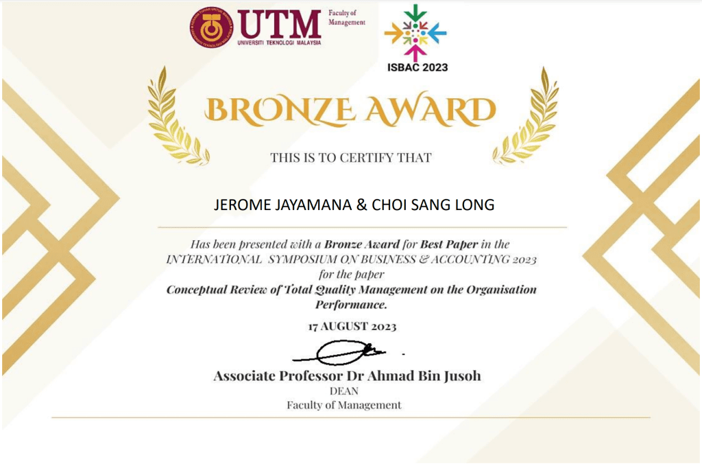 Raffles University takes immense pride in announcing the remarkable achievement of our distinguished scholars, Prof. Dr. Choi Sang Long and Mr Don Jerome Pryantha Jayamana. Their research paper, titled “Conceptual Review of Total Quality Management on Organisational Performance,” has been honoured with the prestigious Bronze Award for Best Paper at the International Symposium on Business & Accounting 2023 (ISB)