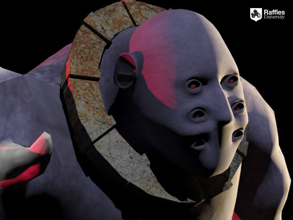 Visual appearance : six red eyes, blue skin color, muscular body, scars on chest