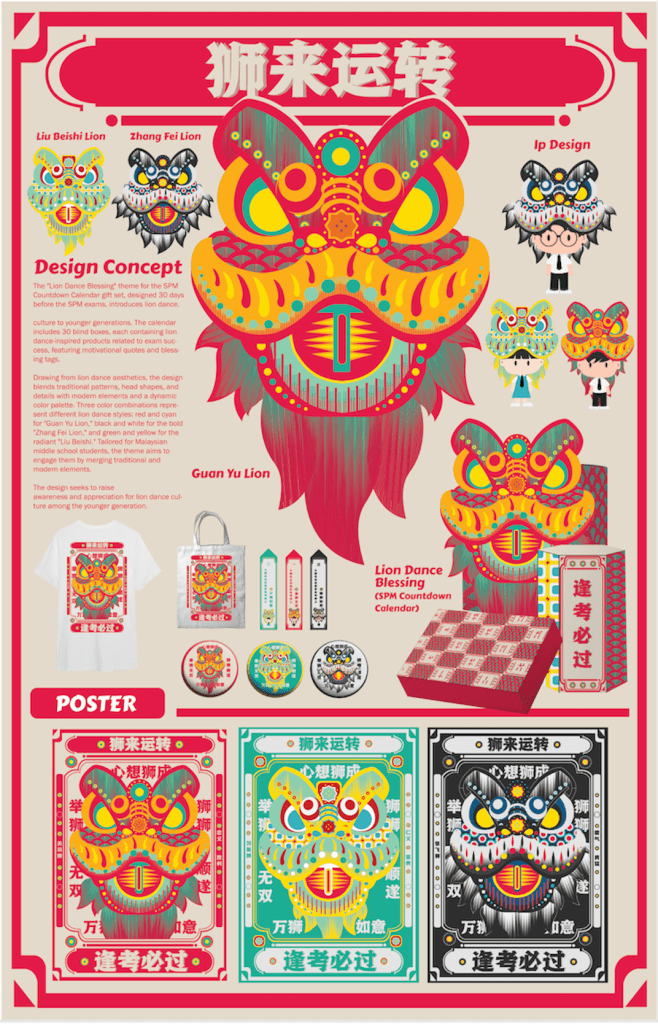 The “Lion Dance Blessing” is an SPM Countdown Calendar gift set designed to be introduced 30 days before the SPM exams. It aims to raise awareness and appreciation for lion dance culture among the younger generation.