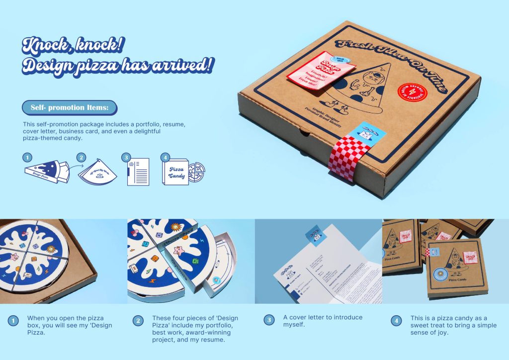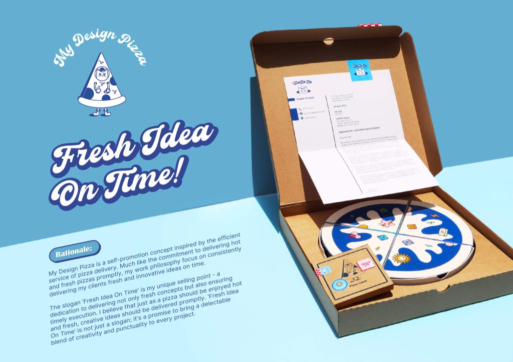 My Design Pizza is a self-promotion concept inspired by the efficient service of pizza delivery. Much like the commitment to delivering hot and fresh pizzas promptly, my work philosophy focuses on consistently delivering fresh and innovative ideas to my clients on time