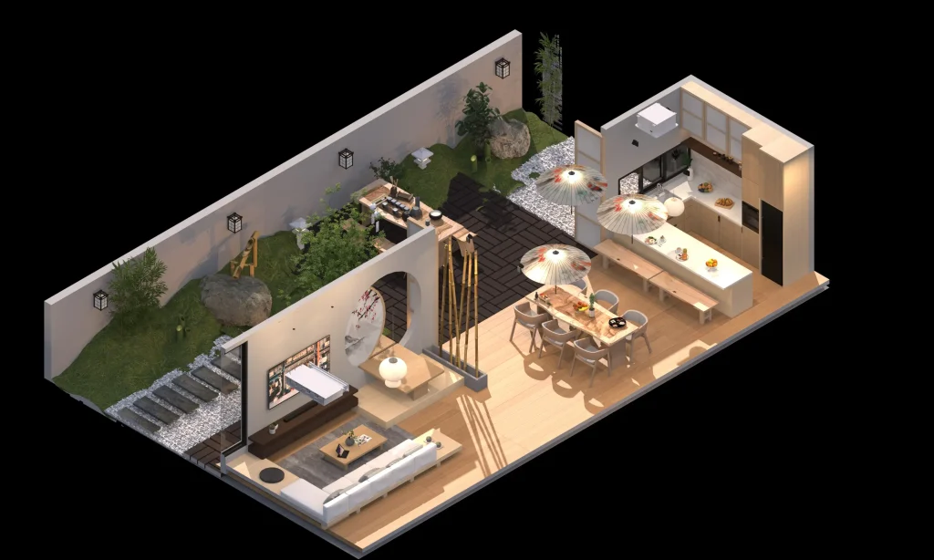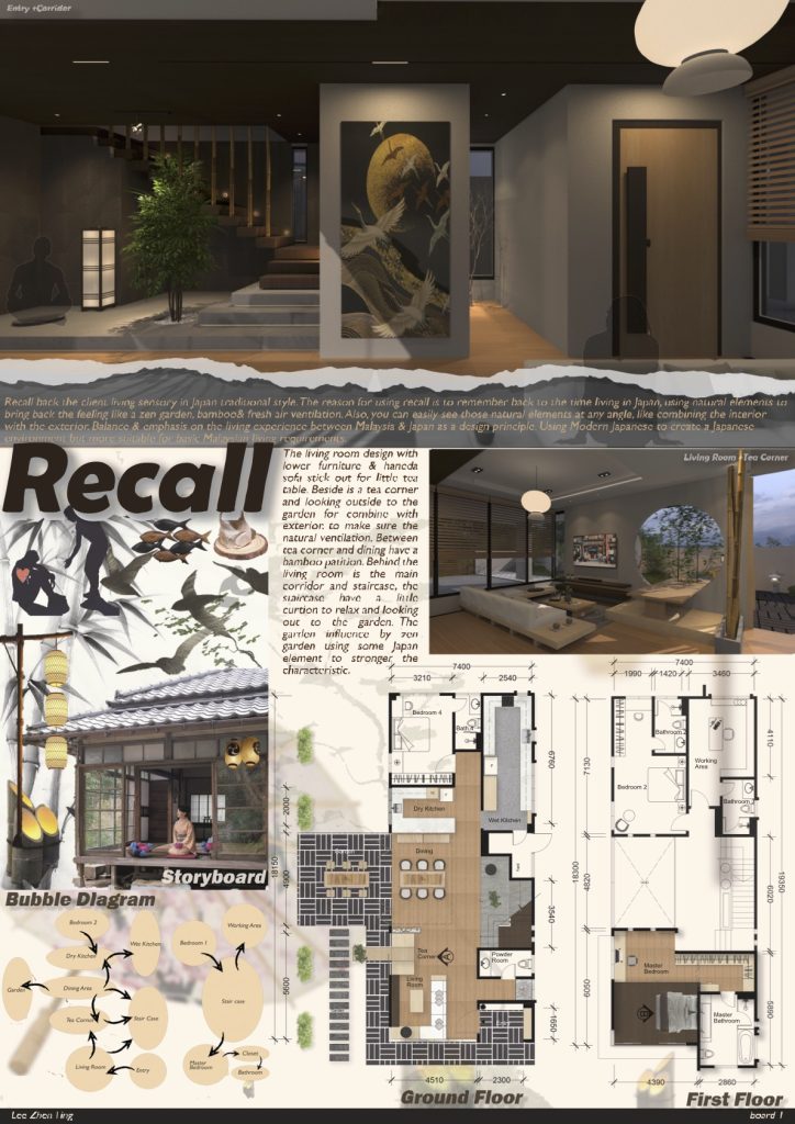 Recall back the client living sensory in Japan traditional style. The reason for using recall is to remember back to the time living in Japan, using natural elements to bring back the feeling like a zen garden, bamboo & fresh air ventilation. Also, you can easily see those natural elements at any angle, like combining the interior with the exterior. Balance & emphasis on the living experience between Malaysia & Japan as design principle. Using Modern Japanese to create a Japanese environment but more suitable for basic Malaysian living requirements.